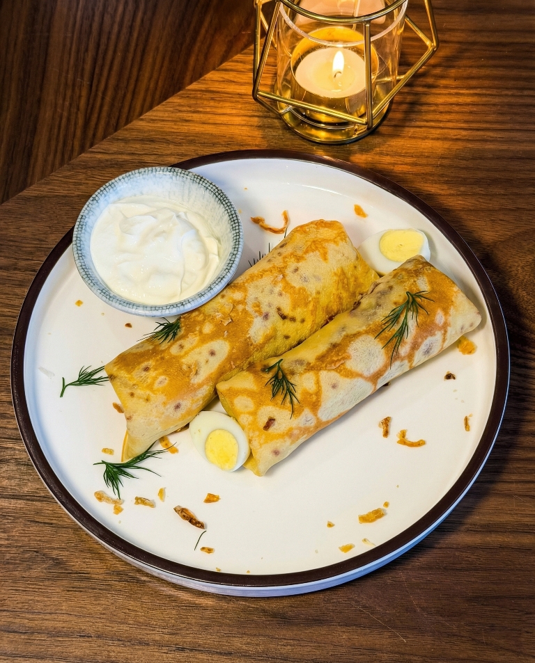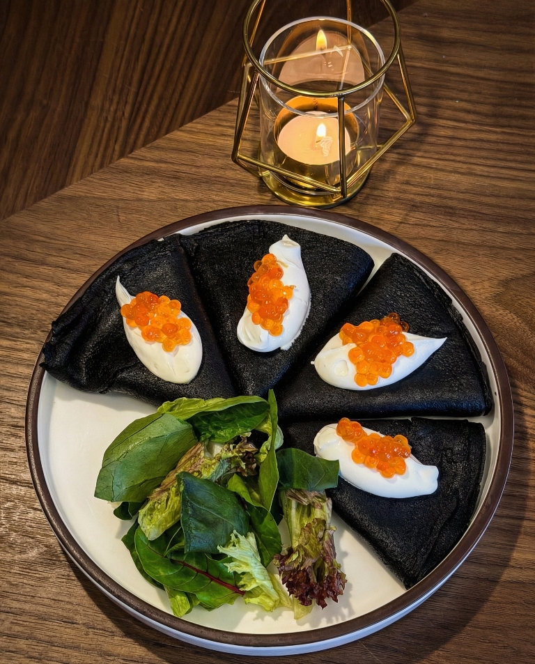 Кружевные чёрные блины с красной икрой и сметаной
