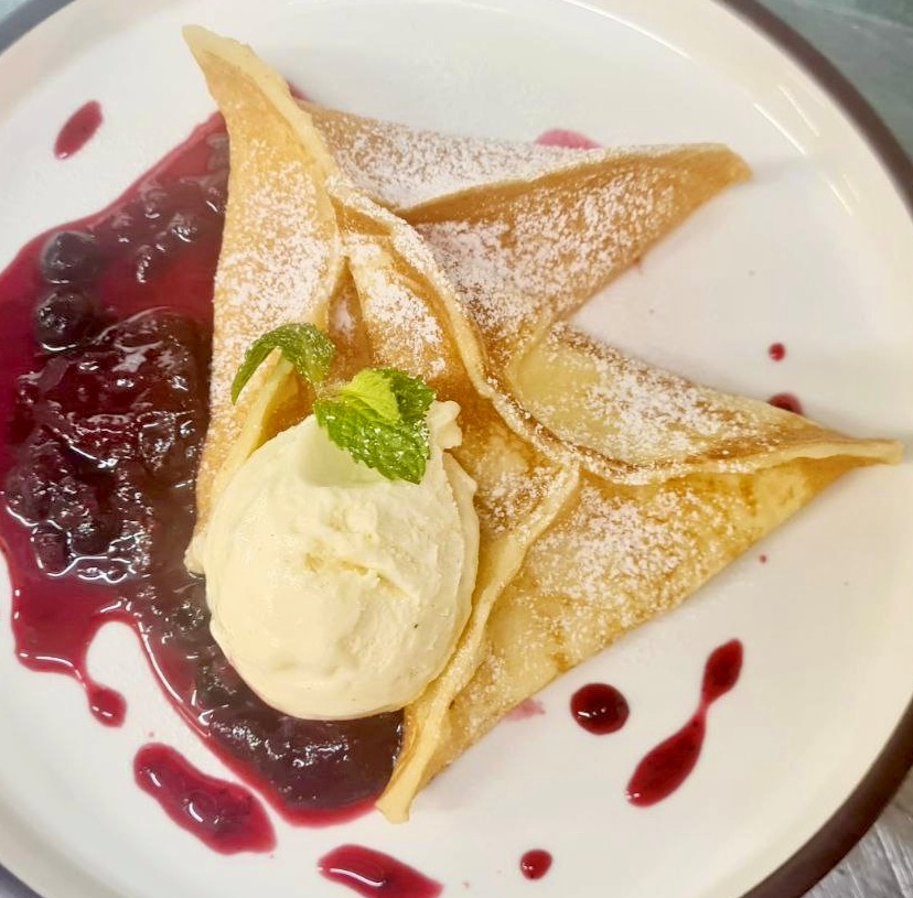 Манные блины с кремом маскарпоне, ягодным соусом и мороженым