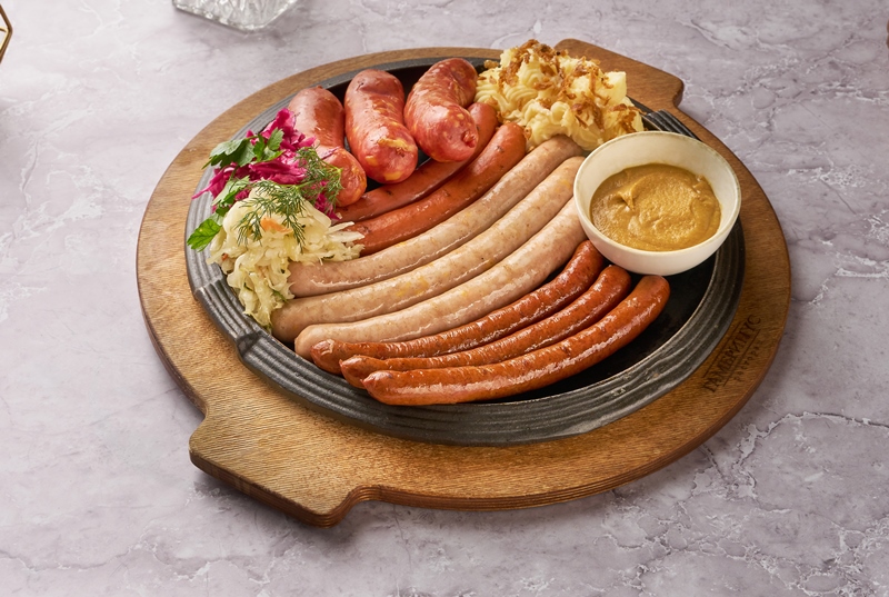 Состав: свиная рулька, куриное бедро, запечённые свиные рёбра, куриные крылья, острые колбаски, картофельные дольки, картофель фри. Соуса: рамштайн, джангли и чесночный.