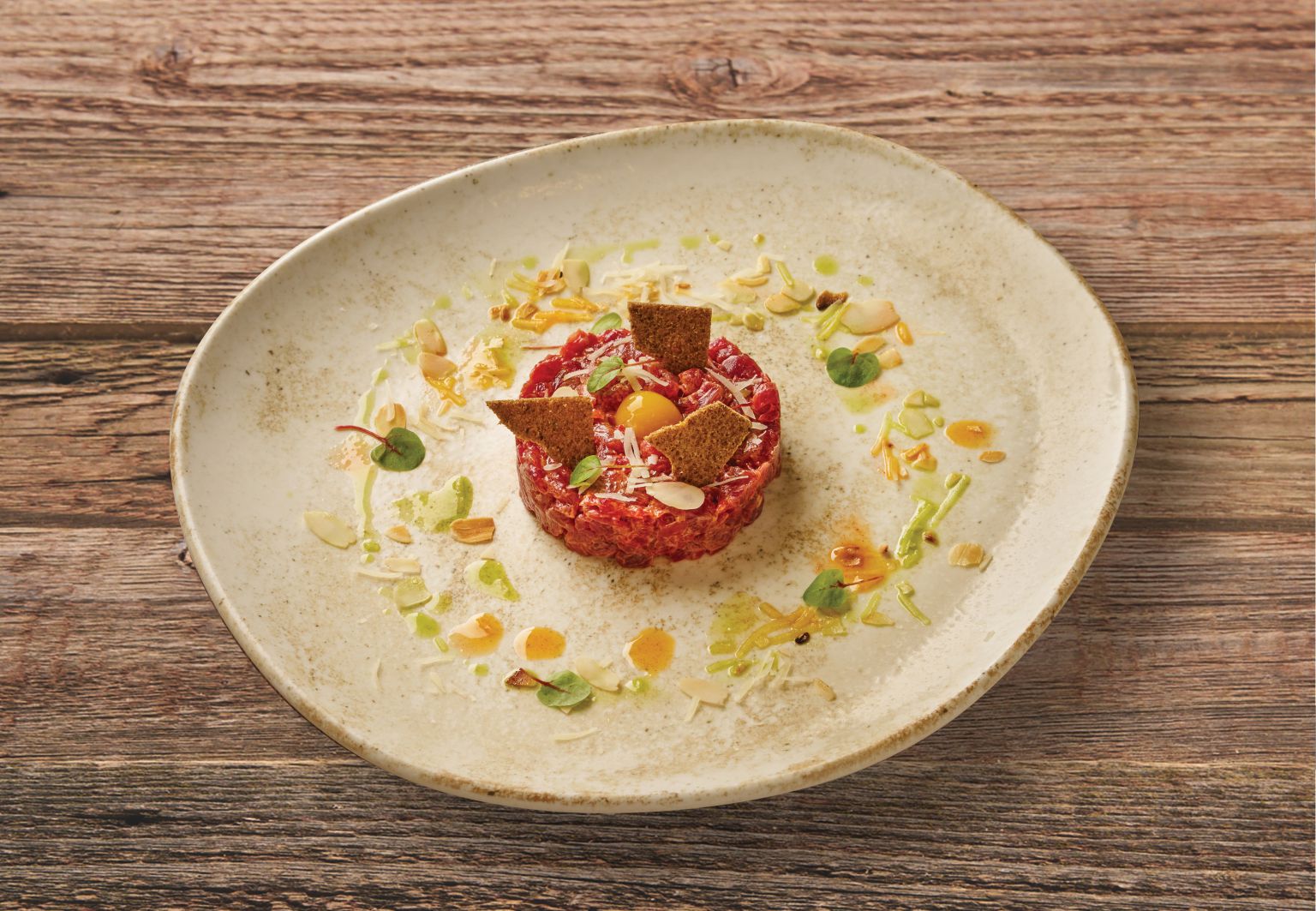 Состав: говяжья вырезка, перепелиное яйцо, маринованные огурцы, корнишоны, красный лук, соус шрирача, зеленое масло
