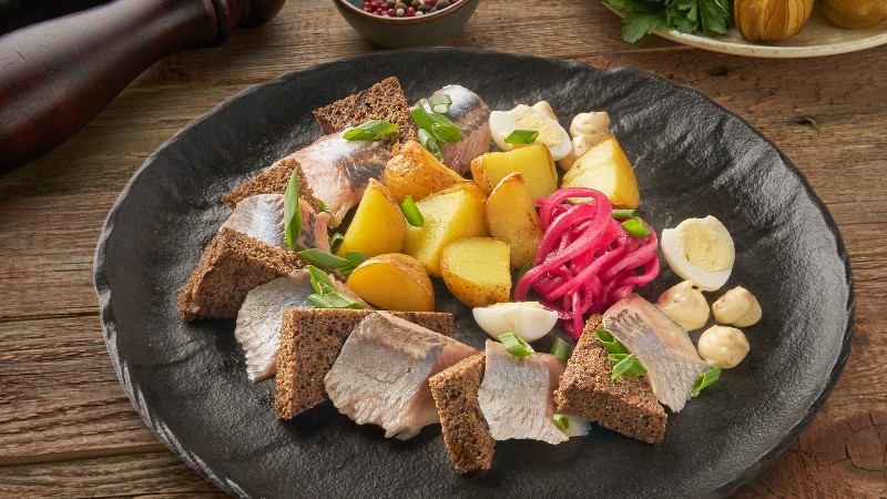 Состав: хрустящие тосты из бородинского хлеба, сельдь, лук, сырокопчёная колбаса, бастурма, суджук, маринованные огурцы в беконе, сало в специях.